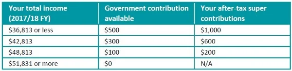As a general rule, for every dollar you contribute, the Government will contribute 50c (up to $500), depending on your income. For example: